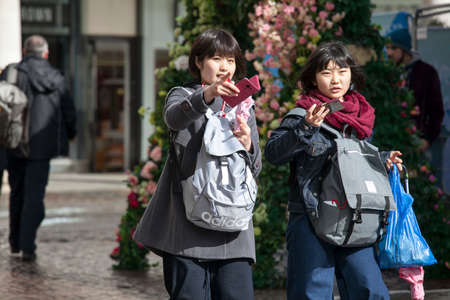 LONDON, ENGLAND - March 12, 2017 Two Japanese tourists with pink phones and backpacks go on shopping