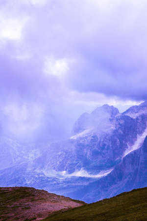 Italian Dolomites mountain peaceful hazy evening dusk view from Giau Pass. Climate, environment and travel concept scene.