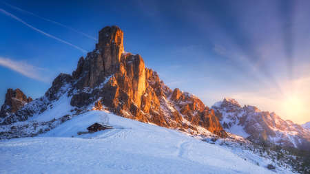 Fantastic winter landscape, Passo Giau with famous Ra Gusela, Nuvolau peaks in background, Dolomites, Italy, Europe