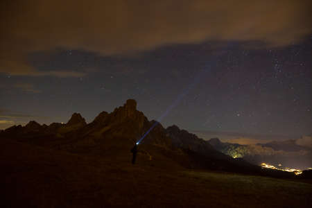 High mountains and stars. Giau Pass, Dolomite Alps, Italy. Landscape in the highlands at the night. Photo in high resolution.