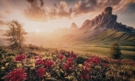 view of sunset in summer on Passo di Giau with mount Ra Gusela on background and rhododendrons on foreground, Colle Santa Lucia, Dolomites, Italy