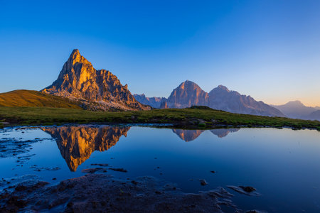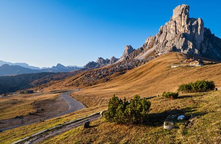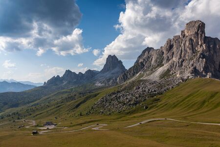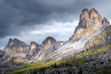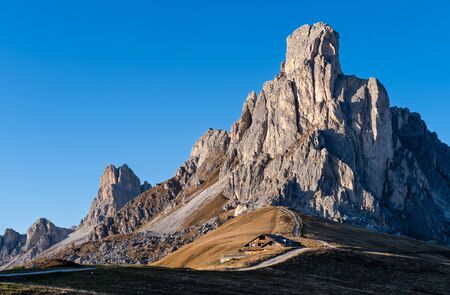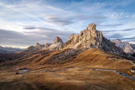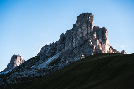 Italian Dolomites mountain (Ra Gusela rock in front) peaceful sunny evening view from Giau Pass. Picturesque climate, environment and travel concept scene.