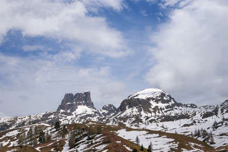Beautiful snowy landscape of the Averau mountain surrounded by pine trees and other mountains in the Italian Dolomites, Europe