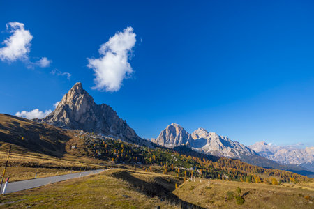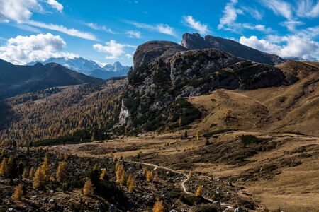 Fantastic autumn landscape,alpine pass and yellow pine trees,Passo Giau with famous Ra Gusela,Nuvolau peaks in background,Dolomites.