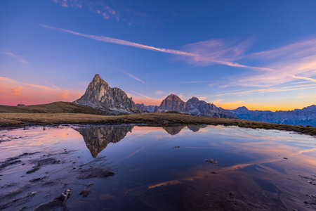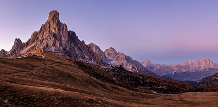 Dolomites mountains the Passo di Giau, Monte Gusela at behind Nuvolau gruppe at sunset in South Tyrol, Italy