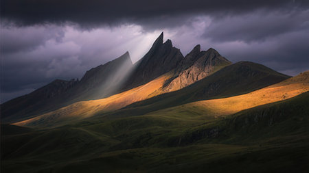 Mountain landscape with dramatic sky. Panoramic view of the mountain range.