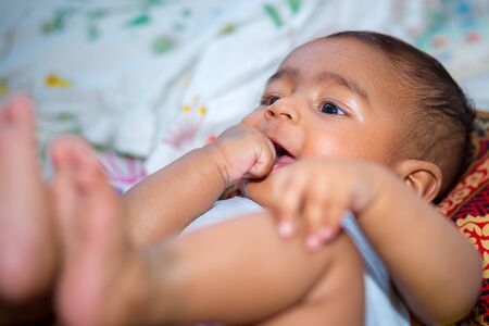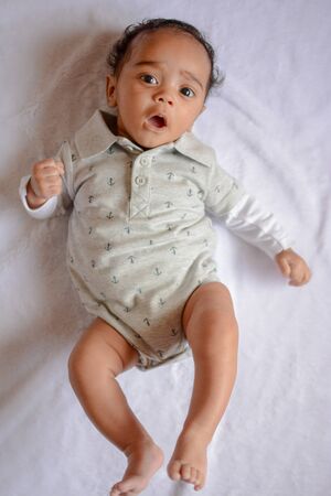 An adorable African-American baby lying in bed and smiling