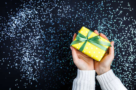Unrecognizable Woman in sweeater holding in hand present, gift box on yellow background. Close-up photo, Gift Concept.