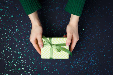 gift on the hands, flat lay on a starry background, holiday greetings