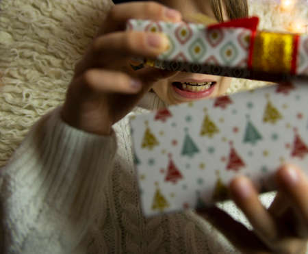 Closeup of young girl's hands unwrapping Christmas, birthday or any other celebration gift
