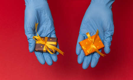 Hands in blue latex gloves holding gift boxes in color paper with polka dots with as a present for Christmas, new year, valentine day or anniversary on red background. Top view