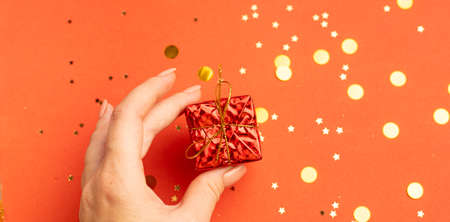 A New Year s gift in a woman s hand . A Christmas present. Copy space. An article about choosing a gift.