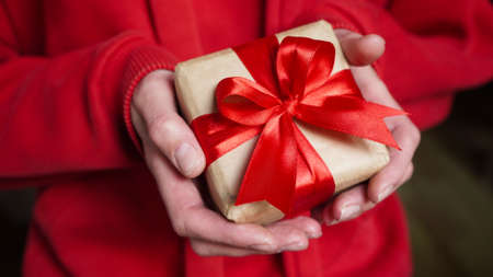 Young woman in red swether holding a gift box wrapped in brown paper and tied with a red ribbon with a bow for a space event. Christmas, New Year, Birthday, Valentine's Day.Close-up.