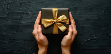 Closeup of two hands holding a gold gift box with a gold bow on a dark background.