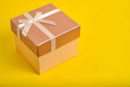 Beautiful golden box on a cream fur blanket. Surprises, gifts, bonuses, concept. Blank for advertising or design, copy space