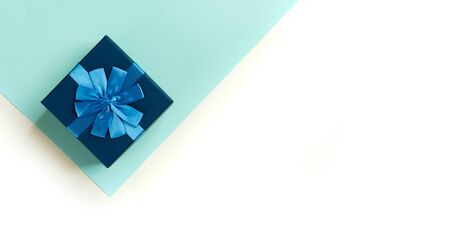 Happy Father's day greeting card with decorated gift box on blue background. Top view. Space for text. Banner.