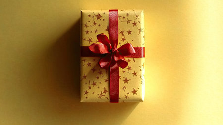 photo of a small golden gift box with red ribbon and star patterns, isolated on a soft yellow background, bright and glowing lighting, joyful and festive mood, advertising photo --chaos 12 --ar 16:9 --weird 150 --v 6.1 Job ID: 504766c0-18a3-4527-bb0c-10ea2ee2b601