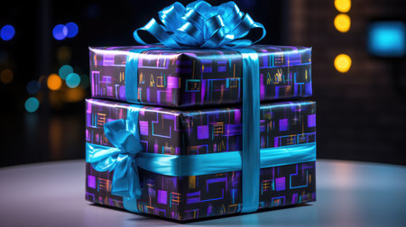 Decorative gift box on a table, captured from above with a ribbon and bow, showcasing ample blank space for adding custom text
