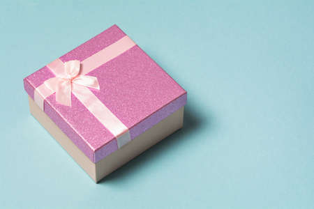 Violet gift box on a blue background. Birthday, mother's or valentine's day gift. Holiday and generosity concept