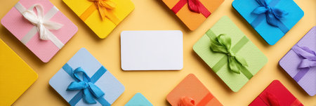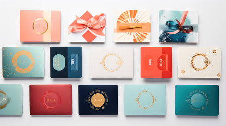 Colorful gift cards are arranged symmetrically around a blank card, creating a festive and visually appealing design perfect for special occasions.