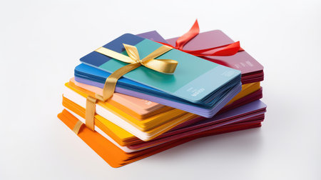 Gift cards arranged neatly and tied with a vibrant red ribbon sit on a textured fabric background, perfect for various occasions and celebrations.