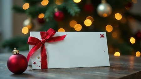 Festive Christmas card design with envelope and holiday decorations.