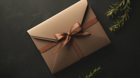 A beautiful gift box adorned with a luxurious golden ribbon is placed on rustic wood, creating an elegant and inviting atmosphere ideal for celebrations.