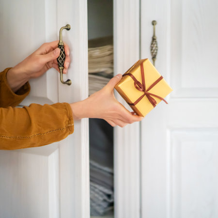 Delivery of Happiness, Hands Holding A Festive Wrapped Box in Front Home Door With Copy Space.