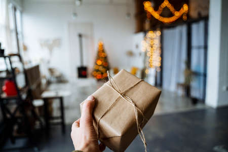 Woman`s hand holding christmas present wraped in natural brown paper with red dotted ribbon