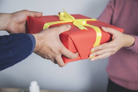 young woman and man hand gift box