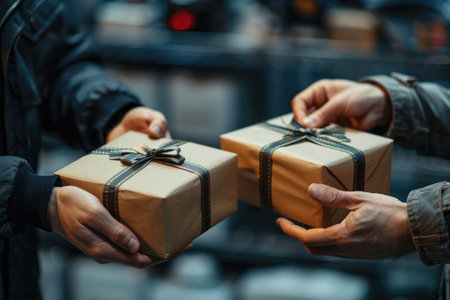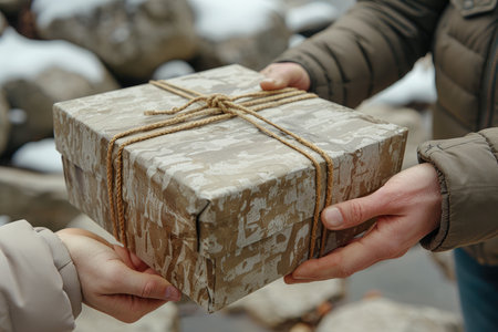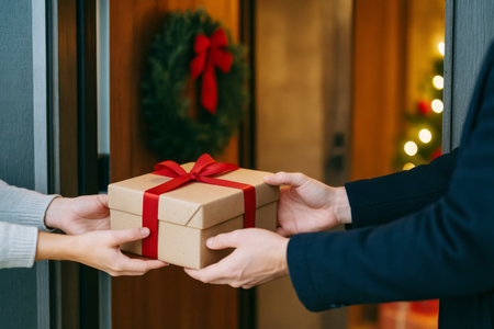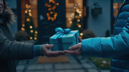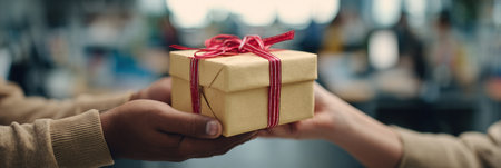 Christmas gift exchange depicted in hands passing wrapped box during holiday season, AI generated