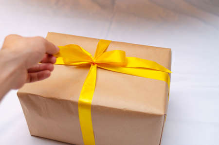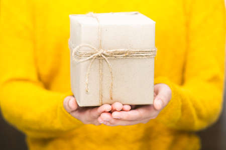 Gift craft box tied with jute close-up in female hands. Concept: gift, delivery, purchase