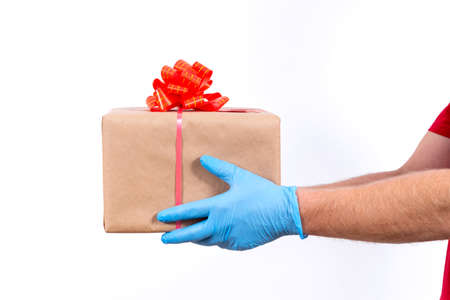 Courier hand in protective medical gloves holds a beautiful gift box with a bow on white