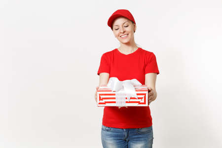 Delivery woman in red uniform isolated on white background. Female in cap, t-shirt, jeans working as courier or dealer, holding red striped gift box with present. Copy space for advertisement