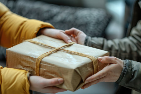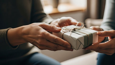 Two pairs of hands are shown exchanging a wrapped gift box. The box, secured with string, presents a soft textured look. Soft lighting emphasizes the hands and the exchange. It could be used for themes of giving, receiving, celebration, or general lifestyle purposes.
