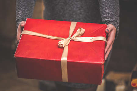 Woman holding a big red gift box. Christmas or valentines day concept. Toned and selective focus.