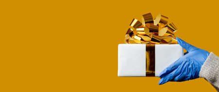 Christmas gift. Pandemic protection. New Year 2021. Greeting celebration. Female hands in medicine gloves holding present box taped golden ribbon isolated on yellow copy space. Advertising background.