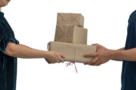 Close up hand customer accepting a delivery of boxes from delivery man postal isolated on white background. Woman hand accepting delivery of boxes from deliveryman.