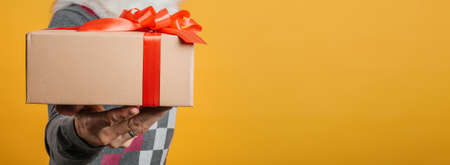 Hands with gift box wrapped in paper tied with ribbon on orange background
