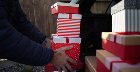 man packing Christmas gift boxes in car