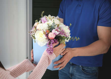 Young woman receiving beautiful flowers from delivery man at home