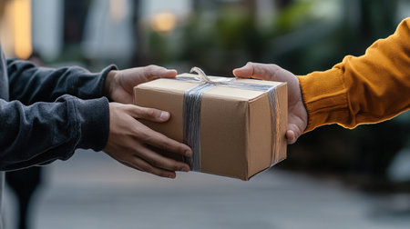 A close-up of hands exchanging a package during a business-to-business delivery service
