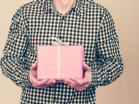 People celebrating xmas love and happiness concept - young man holding present pink gift box in hands