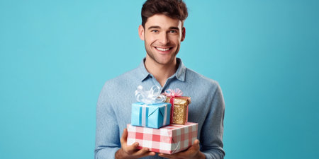 This captivating image showcases a cute young man who is happily surprised, holding a gift in his hands against a serene blue background. His face lights up with sheer delight and astonishment as he uncovers the unexpected present.