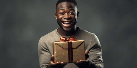 This captivating image depicts a heartwarming moment as a kind-hearted young black man is happily surprised, clutching a gift in his hands against a subtle gray background. His face lights up with pure joy and astonishment as he unveils the unexpected present.