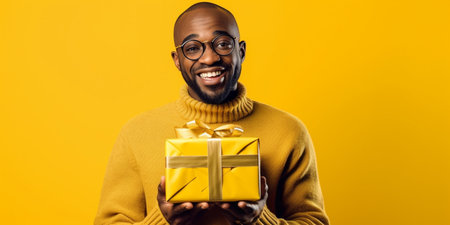 This captivating image captures the genuine happiness of a kind-hearted young black man who is happily surprised, holding a gift in his hands against a vibrant yellow background. His face lights up with pure joy and astonishment as he unveils the unexpected present.