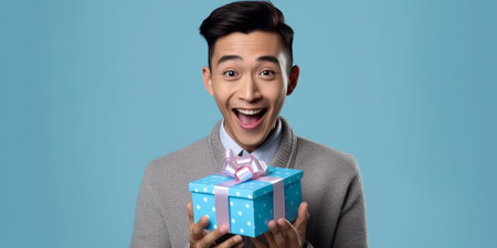 This captivating image showcases the sheer joy and surprise on the face of a nice young Chinese man. He is depicted as he happily cradles a gift in his hands against a vibrant blue background. The man's eyes sparkle with wonder, and his infectious smile reflects his genuine happiness and astonishment.
