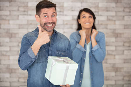 cheerful man giving a present box to his girlfriend