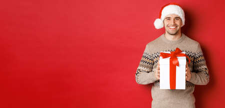 Image of handsome smiling man in santa hat and winter sweater, holding a present, giving christmas gift and wishing happy holidays, standing over red background
