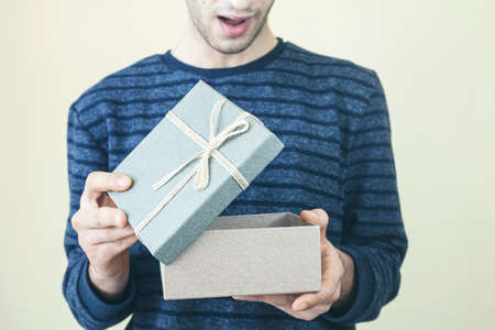 Portrait of a young man holding a gift box in his hands.